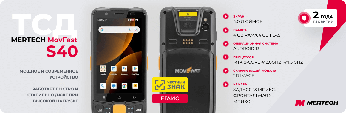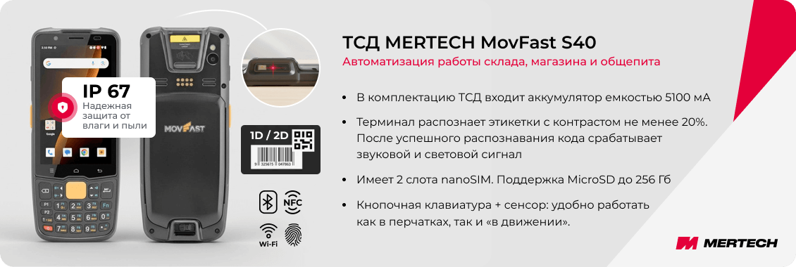 Терминал сбора данных MERTECH MovFast S40 — простое решение для автоматизации бизнеса. Он подходит для учета на складе или в магазине, для обслуживания клиентов в ресторане, кафе или гостинице.